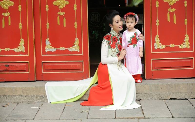 During “đi lễ đầu xuân”, many women and families wear áo dài in shades of red, pink, and ivory.