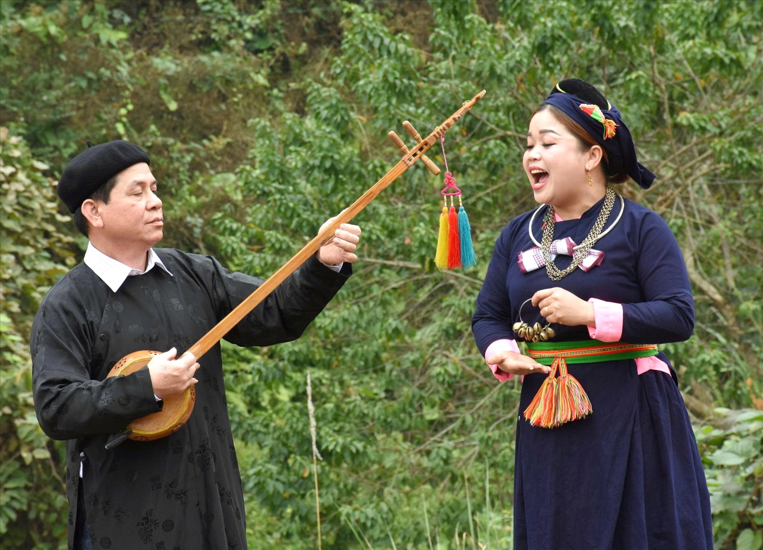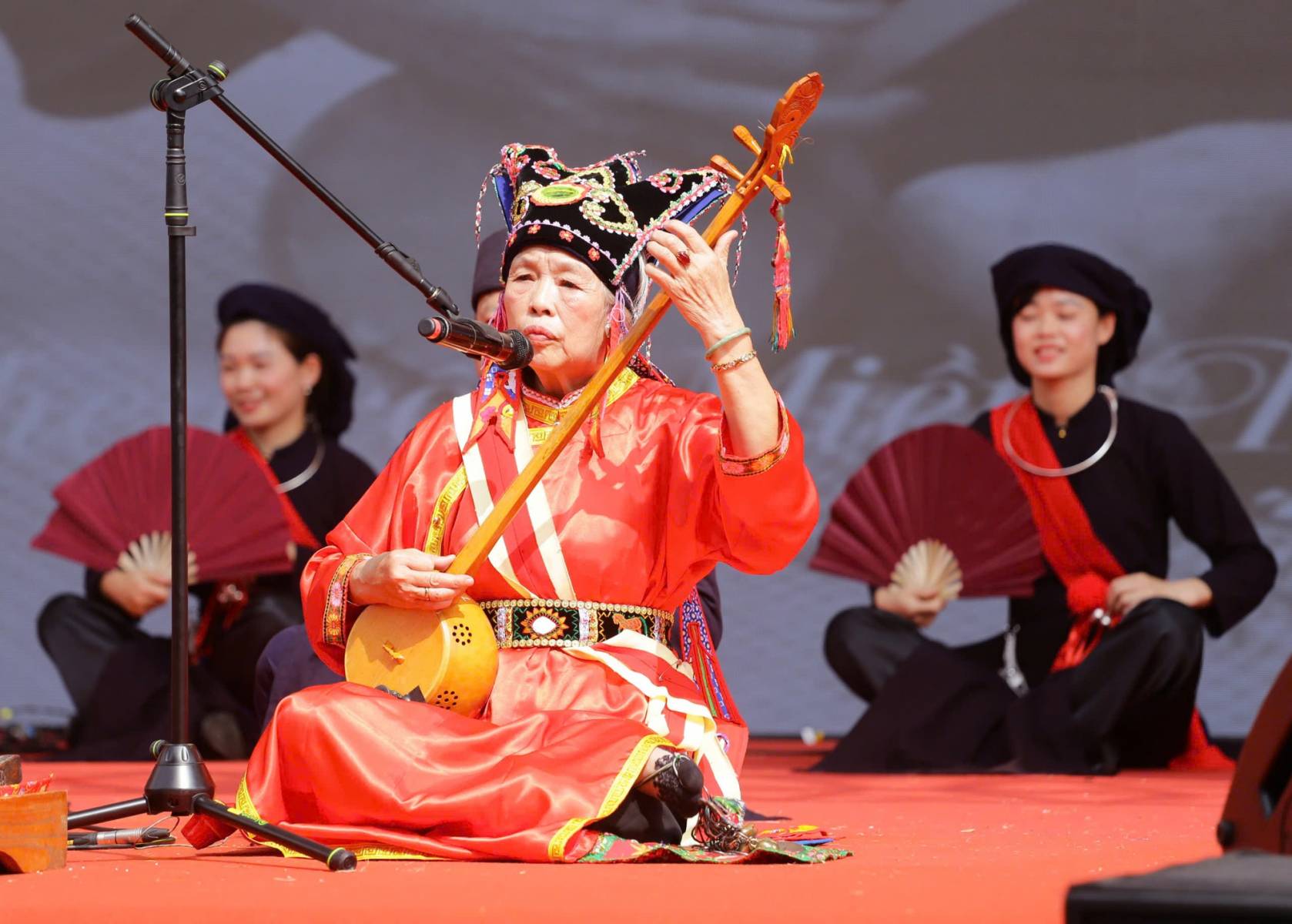 A Then performance is a multi-sensory experience. The Then Master arrives in ceremonial dress — richly adorned, reflective of their role as a spiritual intermediary. As the tính lute begins to sound, the singing unfolds in a distinctive melodic style: ornate, expressive, and shaped by the tonal qualities of the Tày language.