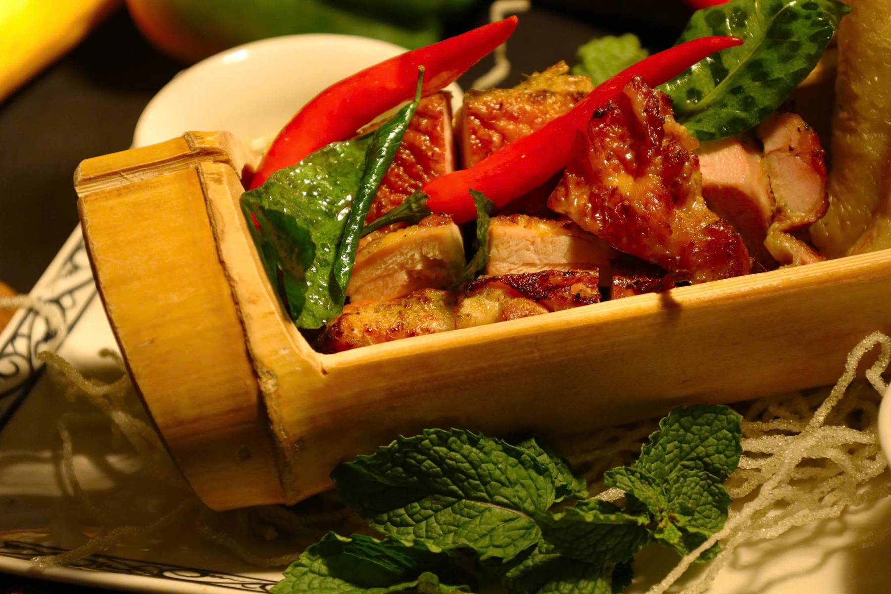 Món ăn này sẽ đặc biệt ghi lại dấu ấn khi được đi kèm với sốt chẩm chéo và sốt ớt xanh, mang vị chua cay đặc trưng xen lẫn vị béo ngậy của thịt gà. Và để hoàn thiện trải nghiệm, không thể thiếu cơm lam ống tre, được dùng cùng với thịt gà và nước sốt để cân bằng những gam màu gia vị khác nhau.