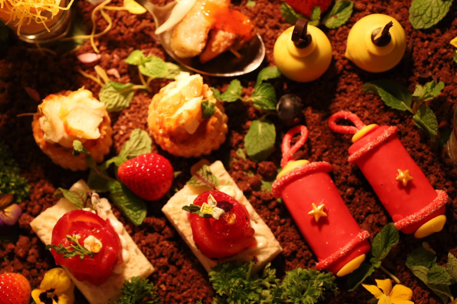 Thưởng thức set trà chiều Vườn Xuân với n hững món bánh xinh xắn được tạo hình giống khu vườn cổ tích vào mùa vụ gặt hái đầu xuân.