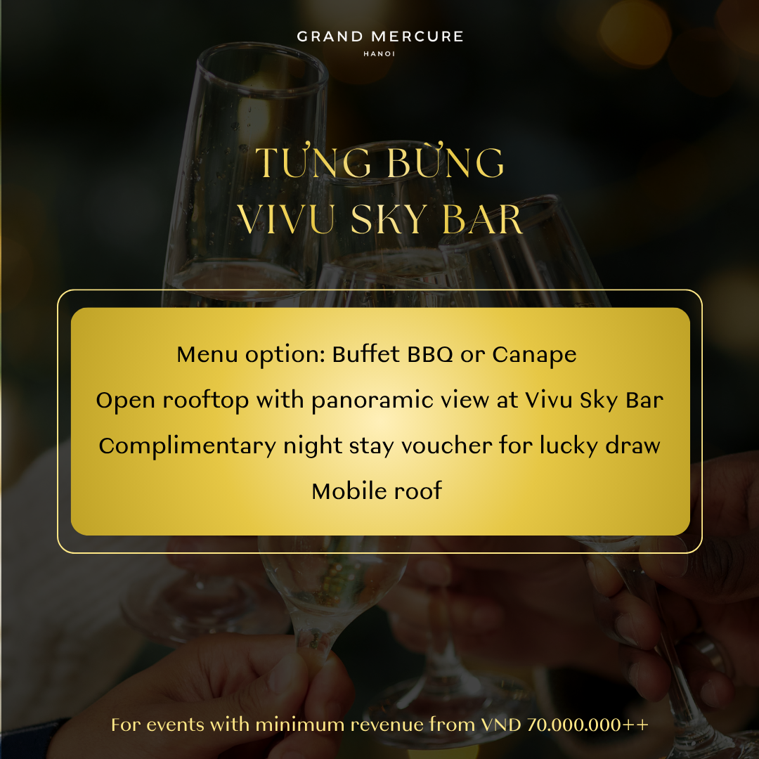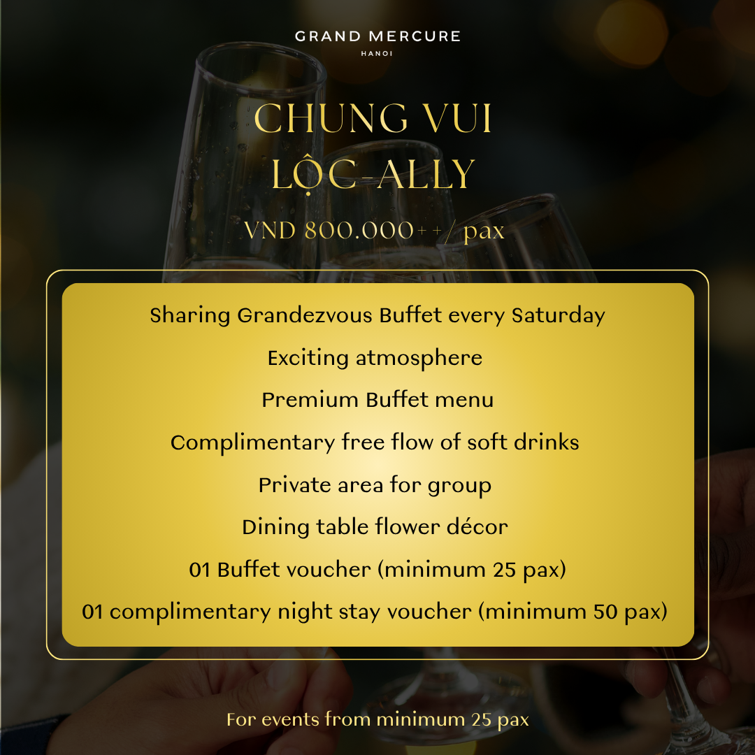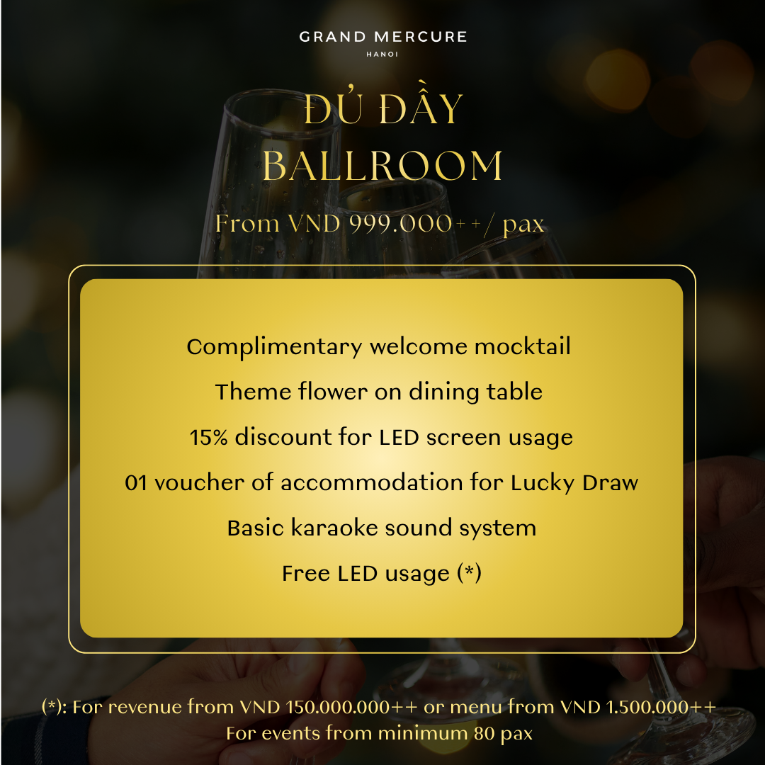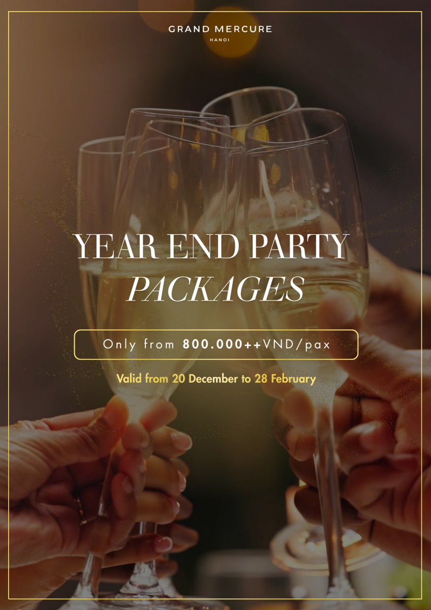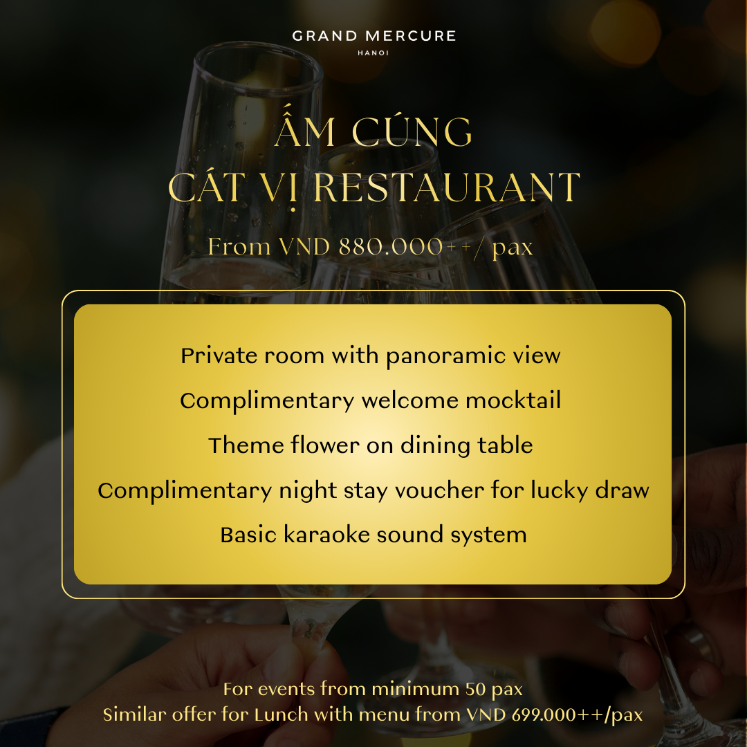 Grand Mercure Hanoi giới thiệu 4 gói ưu đãi tiệc cuối năm, linh hoạt cho mọi quy mô doanh nghiệp. Hãy cùng ăn mừng theo chính phong cách của bạn!
